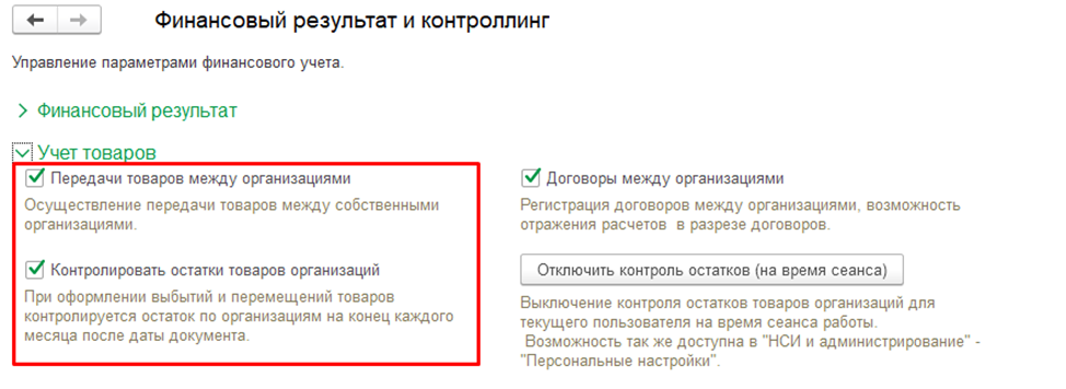 Для того, чтобы система 1С контролировала остатки товаров конкретных организаций следует установить настройки в разделе «Финансовый результат и контроллинг»