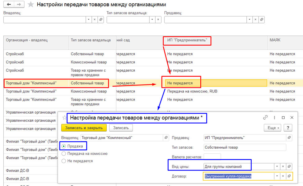 Например, ИП "Предприниматель" продает товар, который есть в наличии на складе ООО «Торговый дом "Комплексный"». Тогда по владельцу товара ООО «Торговый дом "Комплексный"» открываем окно настройки в строке «собственный товар» и выставляем переключатель на «Продажа», устанавливаем вид цены, договор при необходимости: