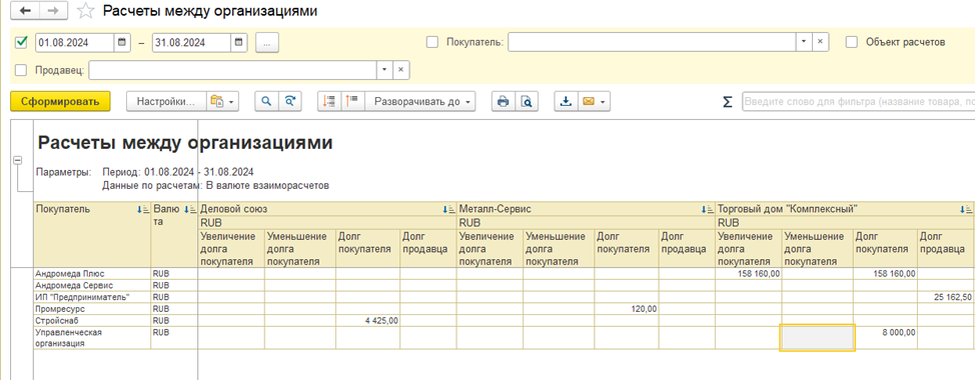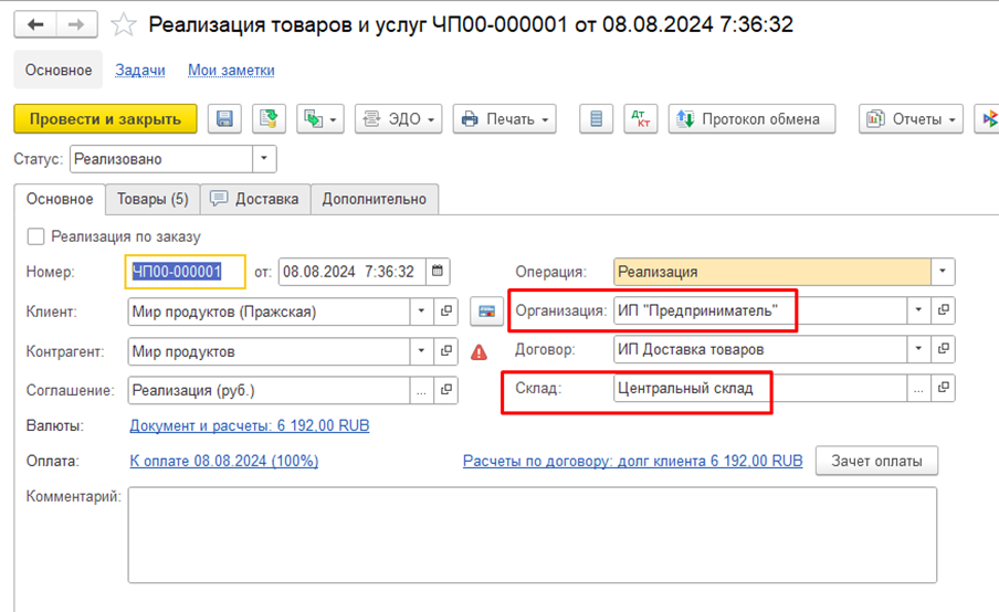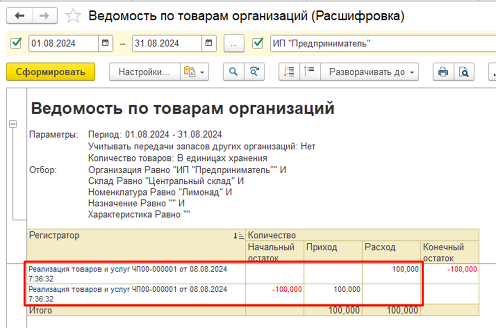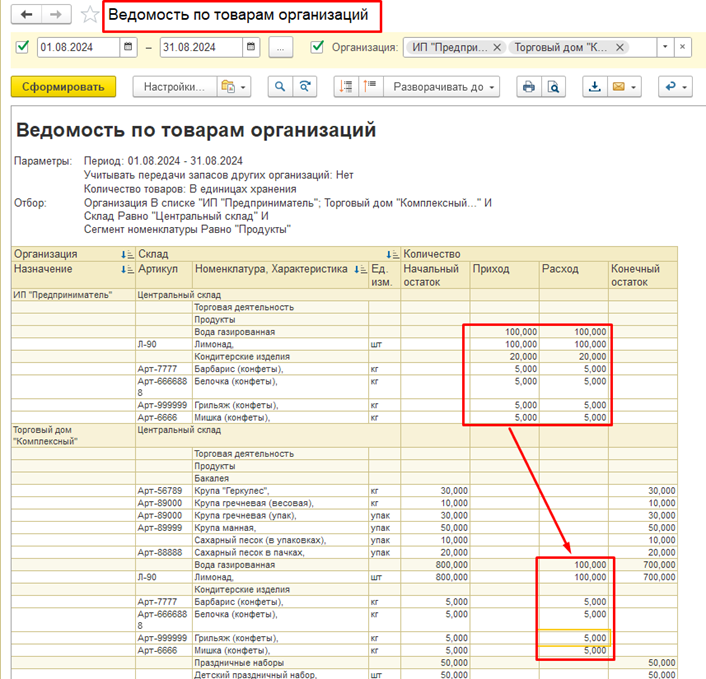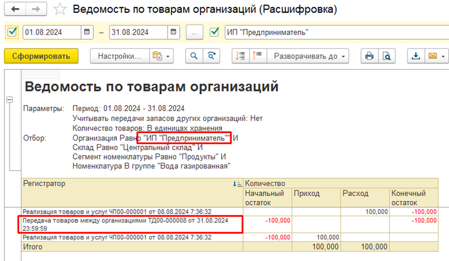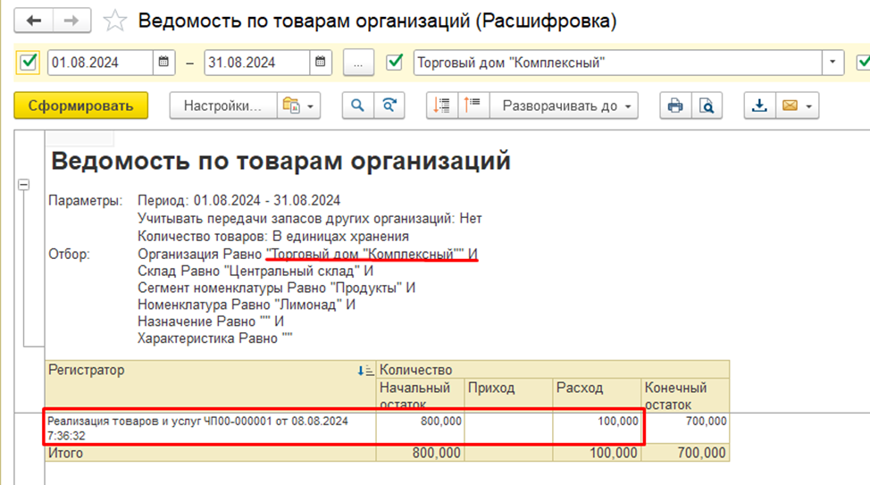 По отчету «Ведомость по товарам организаций» видно, что по организации ИП Предприниматель проданный товар сразу отразился как расход и как приход, но также и по организации ООО «Торговый дом "Комплексный" зафиксировался расход (списание со склада).