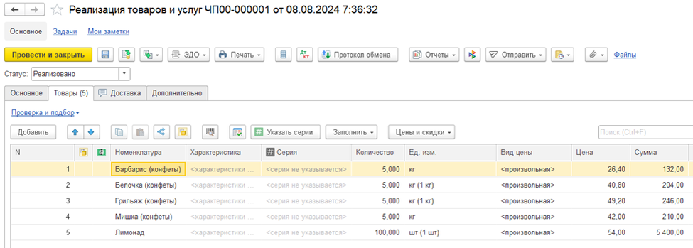 После проведения документа «Реализация товаров и услуг» система записывает информацию о продаже такого товара.