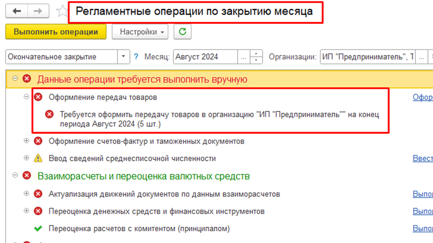 При закрытии месяца система проверяет отрицательные остатки между организациями и в случае их наличия предлагает оформить документ передачи.